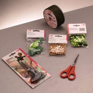 Holzperlenmischung, grünmix (Ø 8mm) | Holzperlen, natur (Ø 8mm) | Holzstreuteile Kleeblatt | Baumwollkordel, olivgrün (ca. 1m lang) | Bastelschere | Nagelbohrer